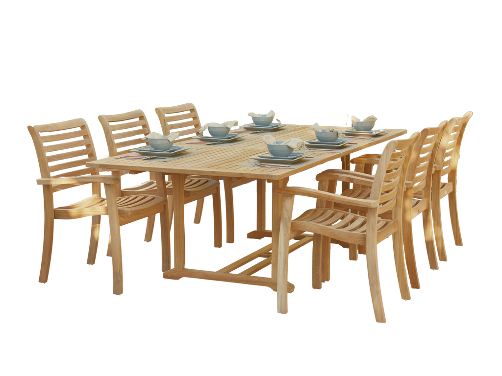 The Birmingham Family Dining Set is designed with substantial premium teak and is one of our best-selling sets. The table features a traditional trestle base and a self-storing extension leaf that glides to open. The curved slats of the chair make it comfortable, whether with or without cushions. This set comfortably seats eight to ten people and will last decades with minimal time-consuming upkeep.