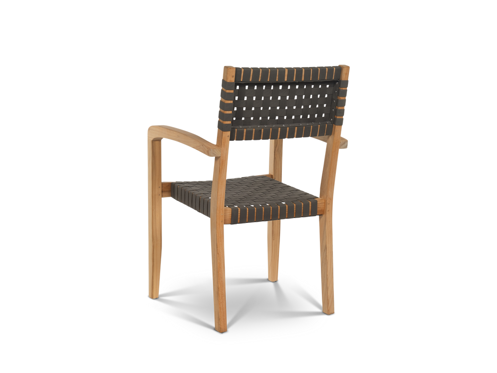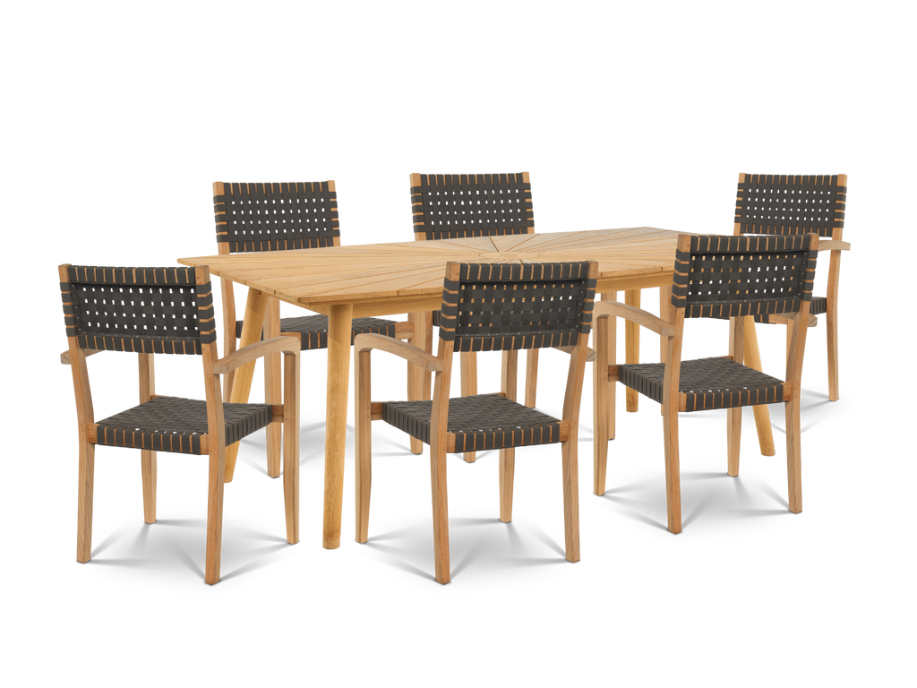 The Cambria Dining Set features our Cambria Rectangular Table's unique starburst pattern of slats and curved sides. The deep overhang of the top allows space for roomy seating and can accommodate eight people. The Herning Armchair has a solid teak frame combined with a hand-woven seat and back straps made from all-weather polyester. This set will be the focal point of your outdoor living space.