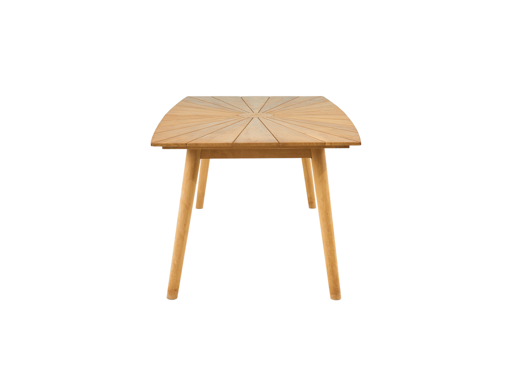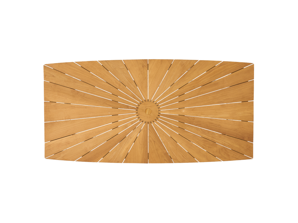 Our Cambria Rectangular Dining Table features a unique starburst pattern of slats and curved sides. The deep overhang of the top allows space for roomy seating and can accommodate eight people. This table will be the focal point of your outdoor living space.