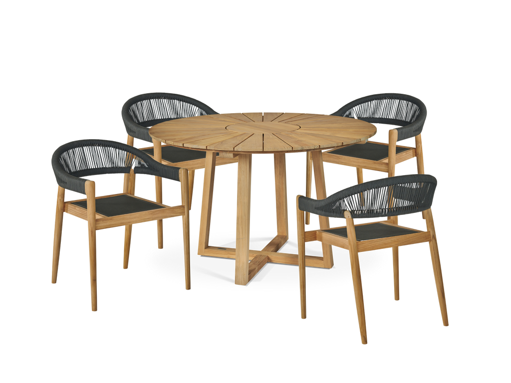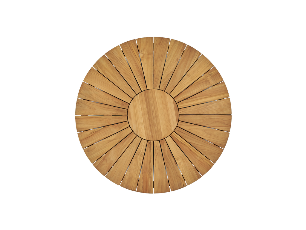 With its unique starburst pattern of slats, the Cambria Round Dining Table will be the focal point of any outdoor living space. The deep overhang of the top allows space for roomy seating and can accommodate four to six people.