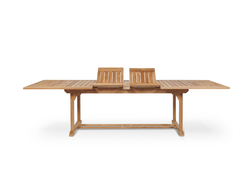 The Devon Dining Set includes a table with a trestle base made from heavy cuts of teak for extra strength, two self-storing leaves, and easy-open glides. The chairs are made from premium teak and feature curved slats on the back and seat for added comfort. This set is designed to comfortably seat 10-12 people and is perfect for families who want to be elegantly prepared for impromptu BBQ dinners with friends.