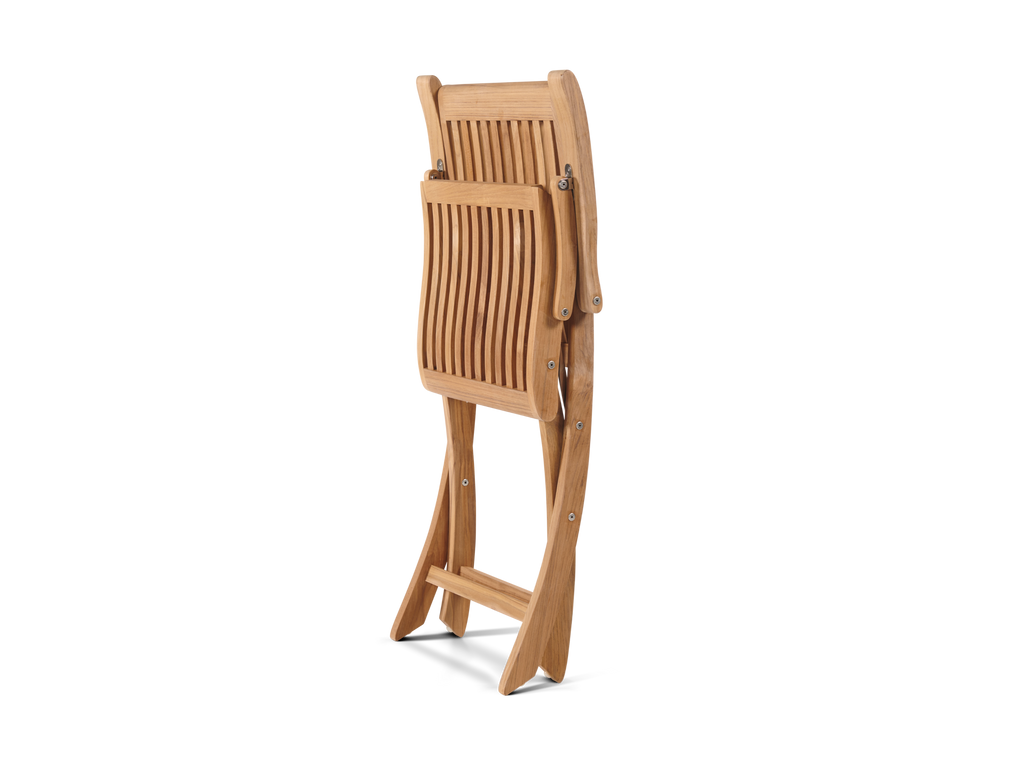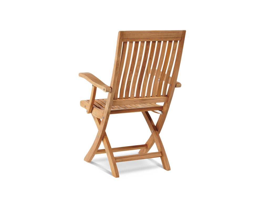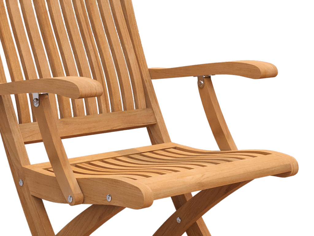 The Devon Folding Armchair is an iconic design for outdoor gardens. This chair is made from premium teak, and features slatted curves on the back and seat for added comfort.