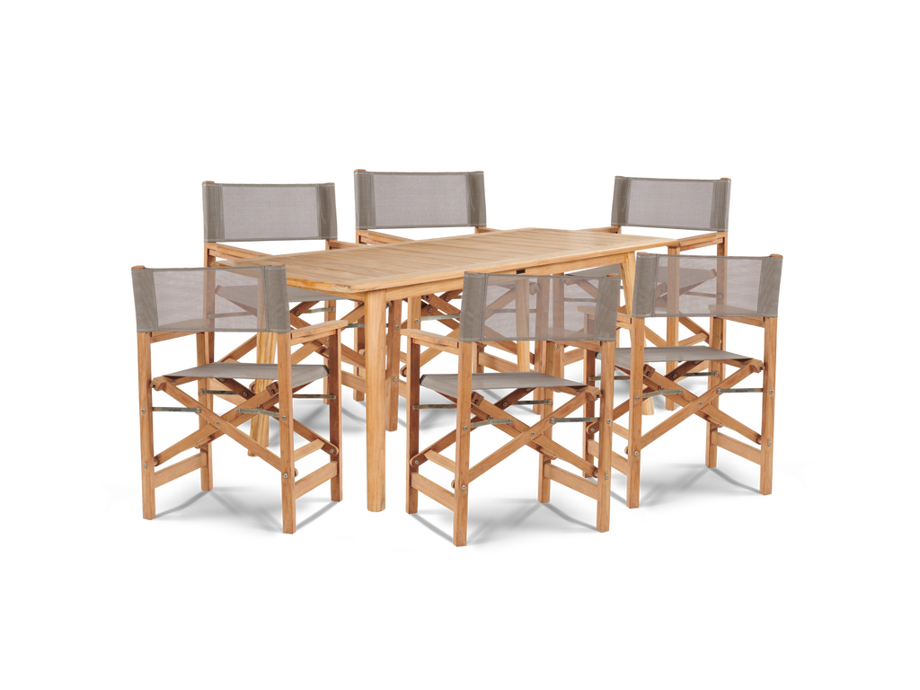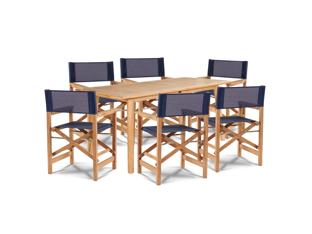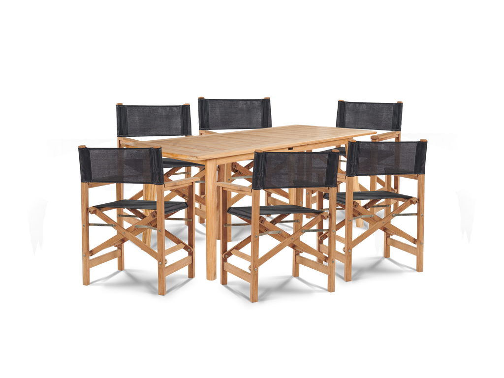 The Director Family Dining Set offers a modern and practical solution for outdoor dining. This set features a sleek table with wide premium teak slats and rounded edges paired with durable folding armchairs. It is ideal for showing off style and functionality at casual gatherings.