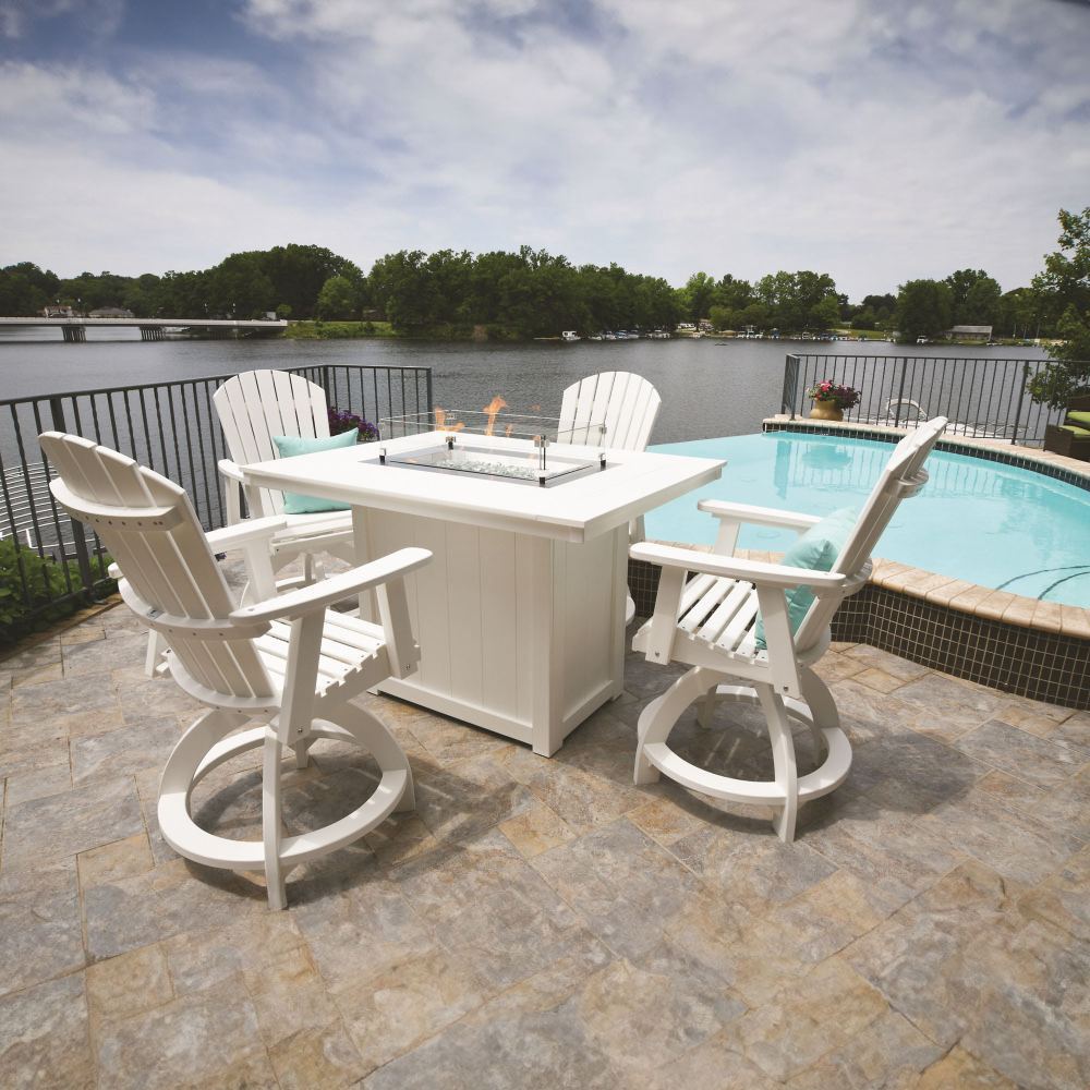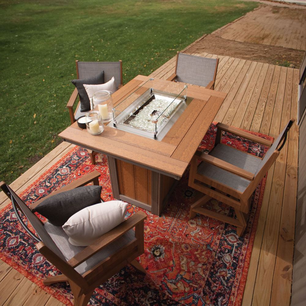 Beautiful and durable, the Donoma 42" x 54" Rectangular Counter Fire Table (DRFT4254C) by Berlin Gardens will help you light up the night! Made for use with a propane tank, this fire table will create ambience and wow factor in your favorite outdoor space. Donoma's clean edges, rustic, wood-like look and versatile frame design give it a unique visual appeal, while sturdy, all-weather construction ensures lasting performance across the seasons. Whether you're looking for a refreshing pop of color, relaxing earth tones or minimalist basics for your next patio upgrade, this outdoor fire table collection is sure to impress at your next gathering. Constructed with PolyTuf™ Lumber, one of the highest grades of poly lumber on the market, this piece is guaranteed to last. This patio fire pit can accommodate 6 people.