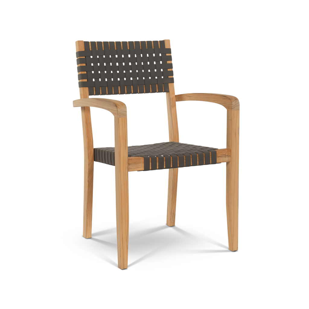 The Herning Stacking Armchair features a fusion of design and materials to bring elegance and year-round comfort to your outdoor spaces. Made from premium natural teak wood, the slim legs of this chair form a frame for a hand-woven polyester strap seat and backrest. It also features simple lines curved to create functional armrests, completing its inviting style.