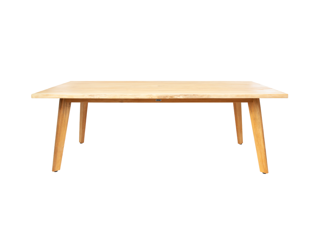 The La Costa Dining Set includes a table with wide, premium teak planks and a live edge, blending rustic and modern styles. The table is 84 inches long and comfortably seats six to eight people without feeling crowded. This set also features the La Costa Armchair, which complements the table with its smoothly curved back and angled back legs.