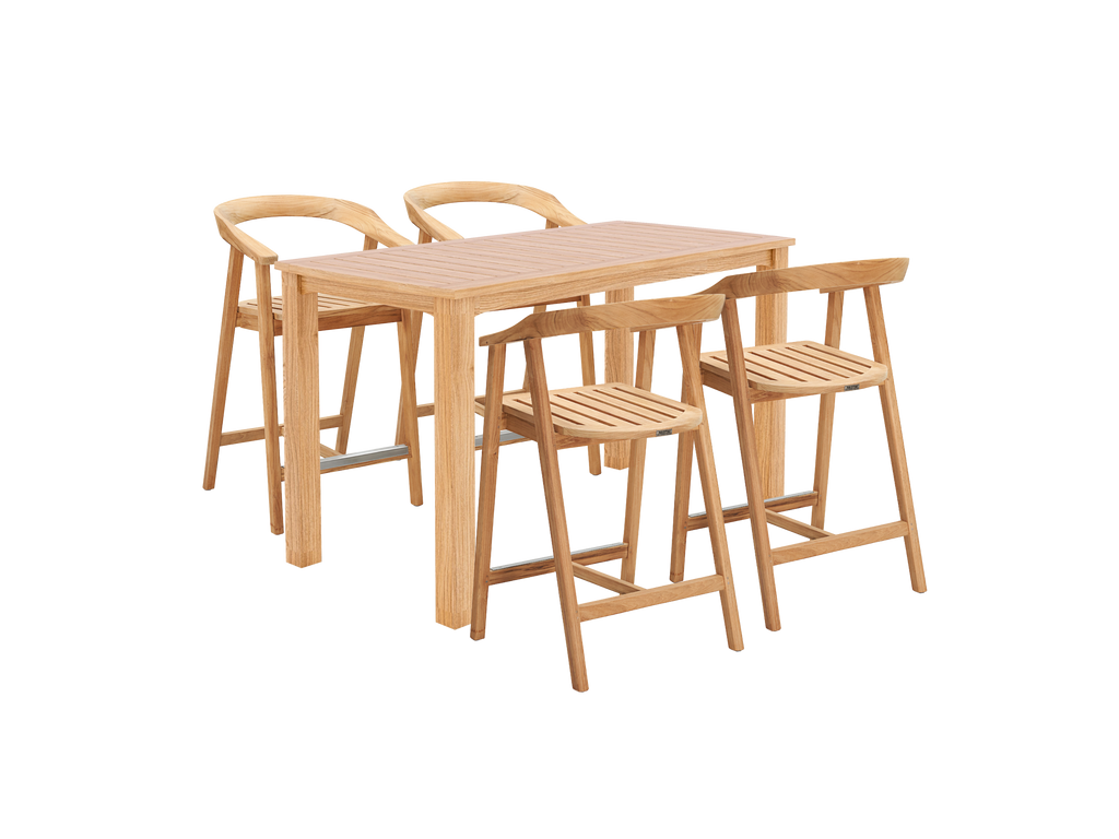 The La Costa Counter Height Dining Set combines mid-century inspiration with modern functionality, crafted from premium teak for enduring style and durability. This versatile set features a counter-height table ideal for outdoor dining, whether by the pool, on the patio, or in an outdoor kitchen. The smoothly curved design of the chairs offers elegance and comfort, perfect for elevating any outdoor living space.