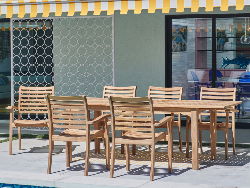 The Manorhouse Extendable Table is a substantial table with transitional details. It is designed for traditional garden and patio spaces and comfortably accommodates eight people.