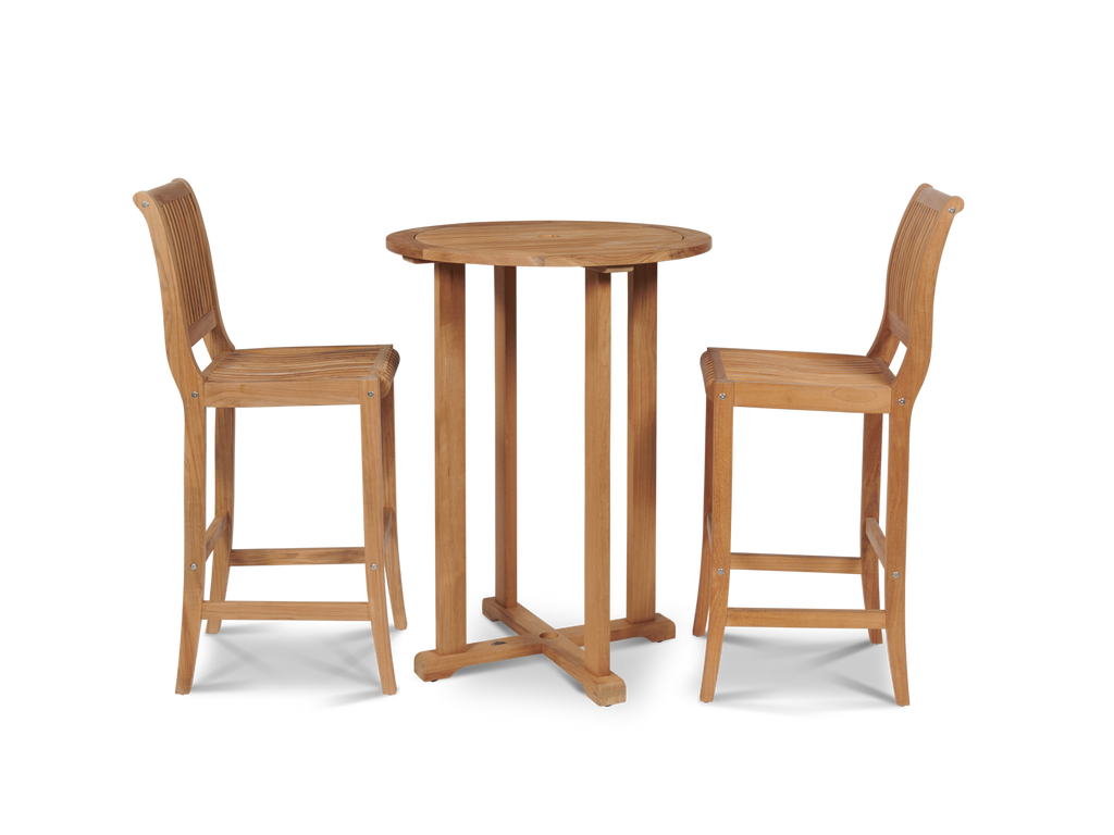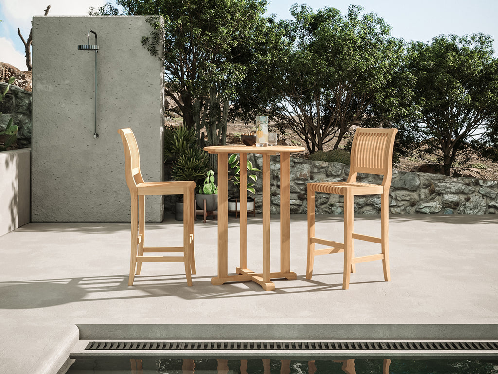The Palm Bar Set adds simple elegance to any outdoor living space. Closely aligned slats are shaped in the seat and back for a great fit and feel, with or without cushions. The rounded elements in the front rail create a distinct profile and make this bar stool even more comfortable. This set is perfect for smaller balconies or by the pool and an excellent outdoor kitchen addition.