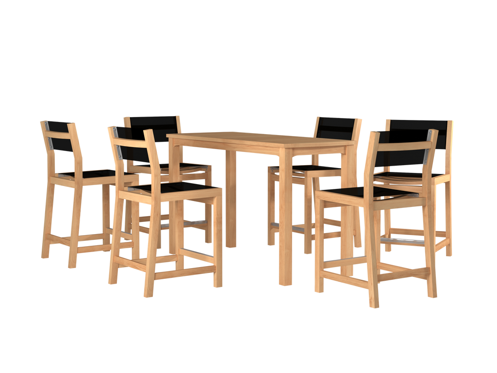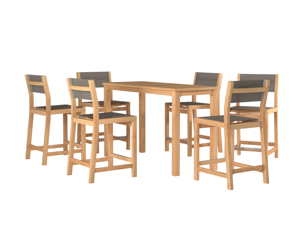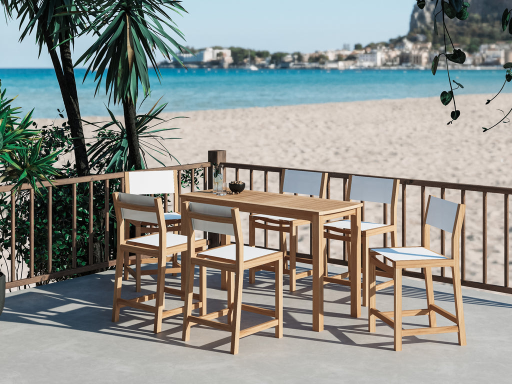 Named after a chic urban district in Paris, the Pearl Counter Height Set is designed for narrow balconies and is a perfect addition to today's bigger outdoor kitchens. The chair combines elegant lines and details of the premium teak frame with a durable seat and back sling for long-lasting comfort. The table is made of substantial cuts of premium teak and will last many years.