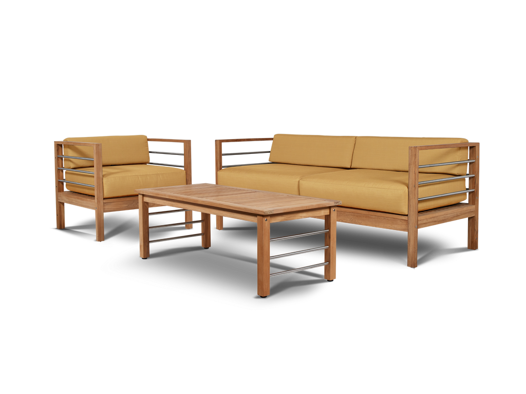 The SoHo Coffee Table reflects today's appreciation of simple modern lines combined with the creative use of mixed materials. This table will age gracefully as the soft gray of the older teak is accented with sleek stainless steel elements.