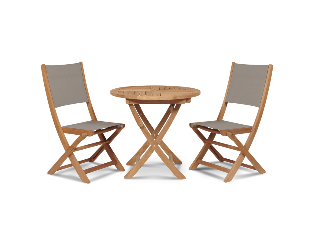 The Stella Bistro Set is perfect for breakfast on a narrow balcony or garden corner. The chair's durable seat and back sling add to the contemporary styling and long-lasting comfort. The table includes an umbrella hole for shades during hot summer days. Set pieces can be folded away for convenient storage.